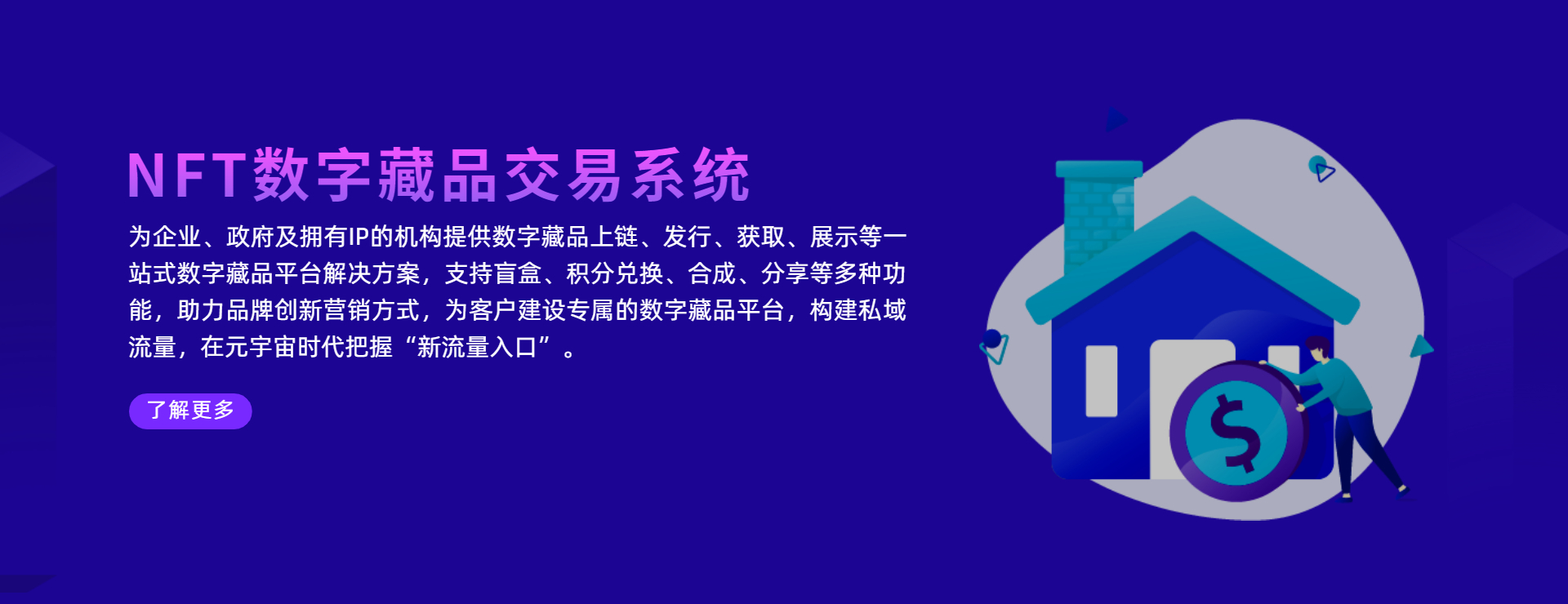 爲企業、政府及擁有IP的機構提供數字藏品上鏈、發(fā)行、獲取、展示等一站式數字藏品平台解決方案,支持盲盒、積分兌換、合成(chéng)、分享等多種(zhǒng)功能(néng),助力品牌創新營銷方式,爲客戶建設專屬的數字藏品平台,構建私域流量,在元宇宙時代把握“新流量入口”。
